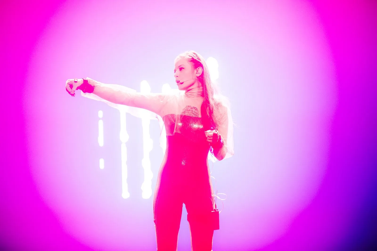 In her futuristic audio-visual live set with mi.mu gloves and effective choreography Chagall controls all electronic layers, vocal effects and interactive visuals with the movement of her hands. She creates an almost hyper-reality, a physical space where normally invisible sound effects are represented visually.