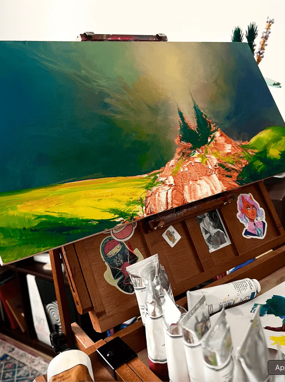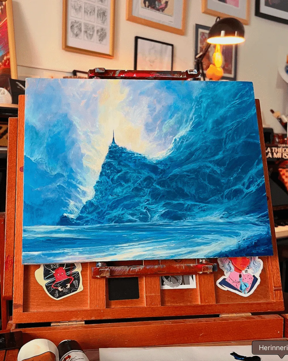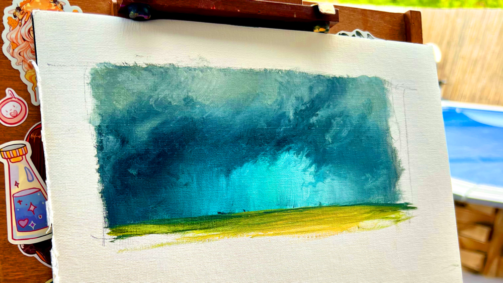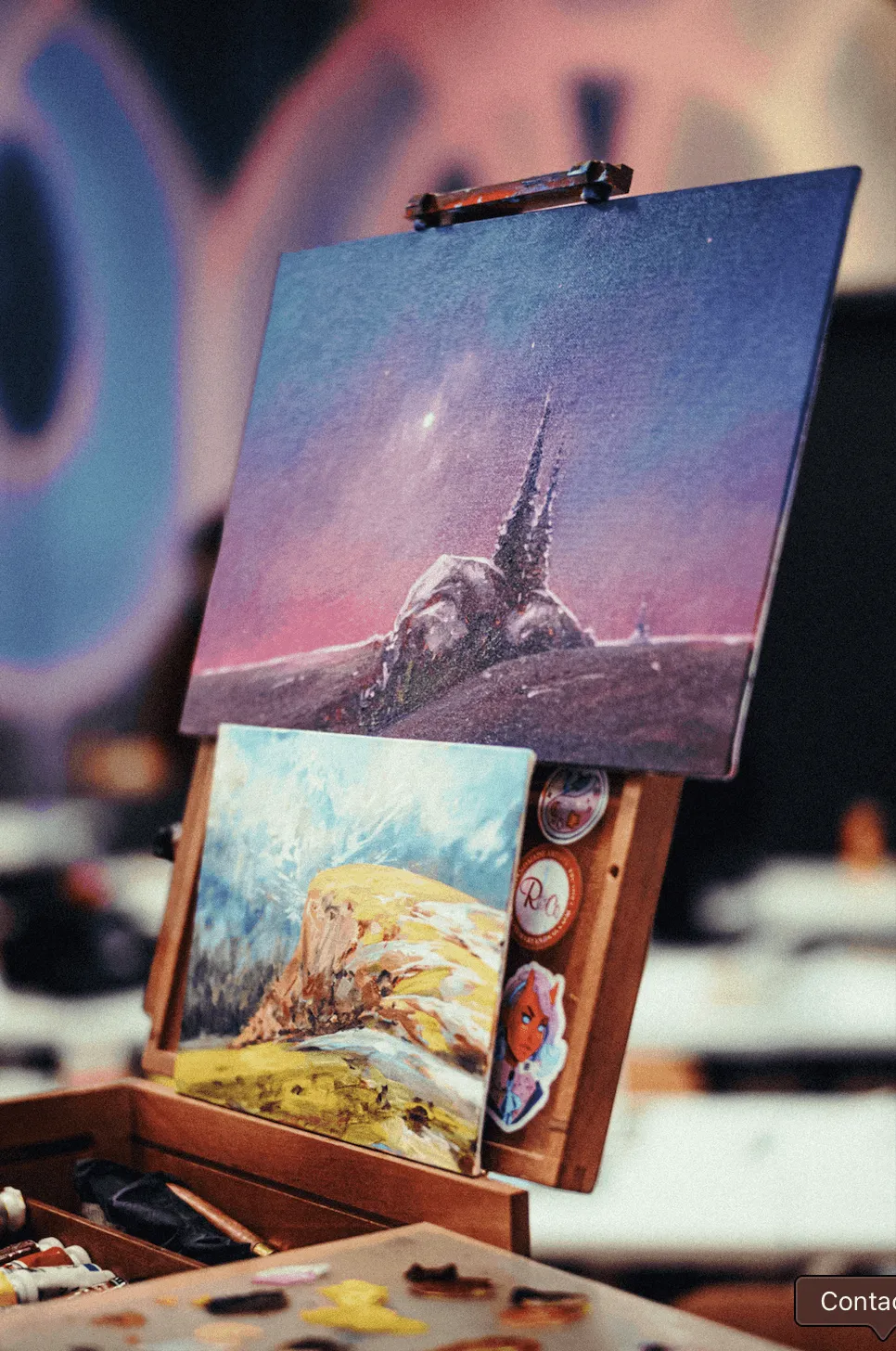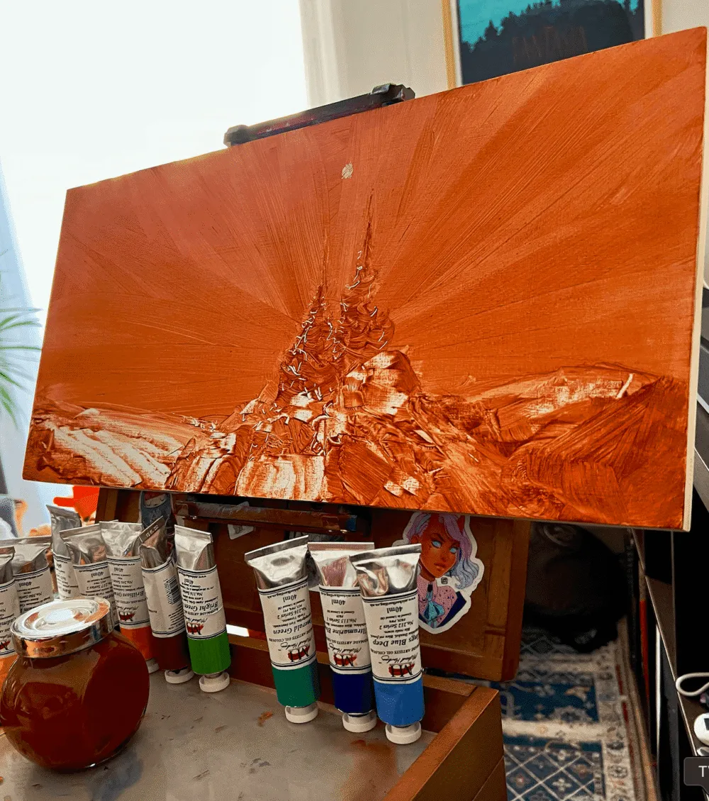 In the Artist Studios, Bastien Grivet plays with oil paint in order to create a dramatic mountain scene, using a limited blend of colors to create strong lights and contrasts.